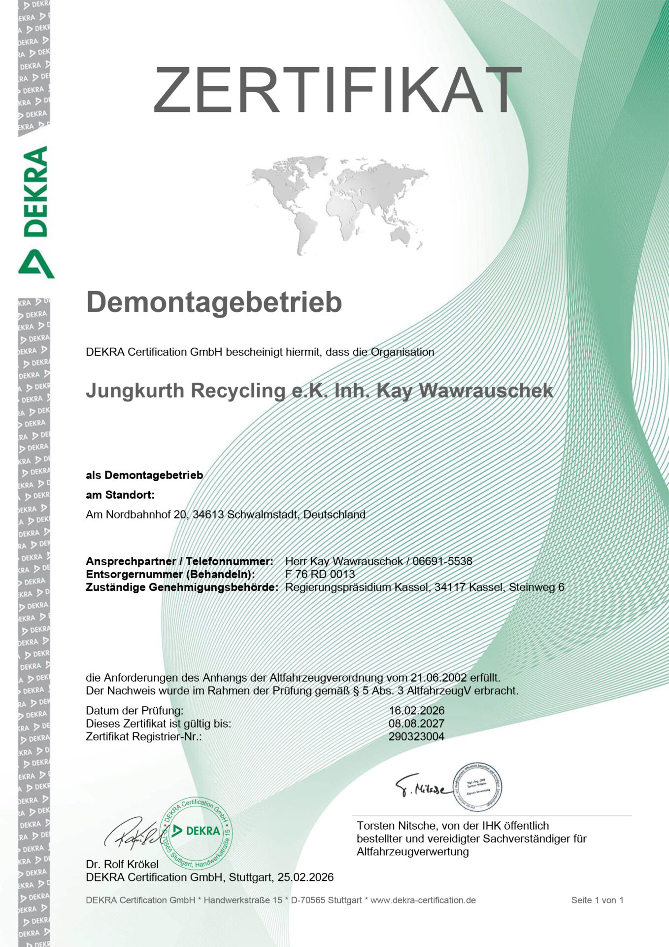 Die Verwertung von Fahrzeugen und Rohstoffen erfolgt nachvollziehbar, dokumentiert und umweltgerecht. Unsere Zertifizierungen stehen für rechtliche Sicherheit, transparente Abläufe und eine verlässliche Abwicklung.